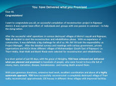 You have Delivered what you Promised Dear All, Congratulations! I want to congratulate you all, on successful completion of reconstruction project in Rajanpur district. It was a great team effort of individuals and groups with one passion in common – to help the nation. After the successful relief operations in various destroyed villages of district Layyah and Rajanpur, it was decided to start the reconstruction and rehabilitation phase. With no experience of construction, it was definitely a big challenge for all of us. Mr. Atif Ali took the responsibility as Project Manager. After the detailed surveys and meetings with various government, private organizations and NGOs three different villages of Mohammadpur (South East of Rajanpur) i.e. Tharri Walla, Shah Walli and Bastti Rinda were selected for reconstruction and rehabilitation. In a short period of just 90 days, with the grace of Almighty, we have achieved and delivered what we planned and promised to hundreds of people, who were forced to live a life full of tears, starvation, disease, homelessness and misery. With your generous donations, extensive hard work, excellent coordination and above all a highly systematic approach, we have successfully reconstructed a completely destroyed village of Thari walla, reconstructed approximately 100 houses in different three villages with improved facilities and with better living standards, reconstructed/repaired mosques and schools, provided water pumps in their court yards, re-established their agriculture by providing seeds and fertilizers, provided free medical treatments and medicines, house hold items and cash donations. All volunteers - worked as a team and with their devotion and smart policies also developed strong sense of brotherhood among the villagers. It is important to mention that We are the only one who actually reconstructed the houses in the district and provided homes to 100 families in such a short time. Now they all have moved back to their new houses and for sure most of them are living in an improved and organized environment with dignity and self esteem. The poor villager lost his house in the flood but you have given him Home and a Hope - definitely you have delivered much more than what you promised. Thank you for being there when you were needed the most. for n behalf of Final Report on the Project |